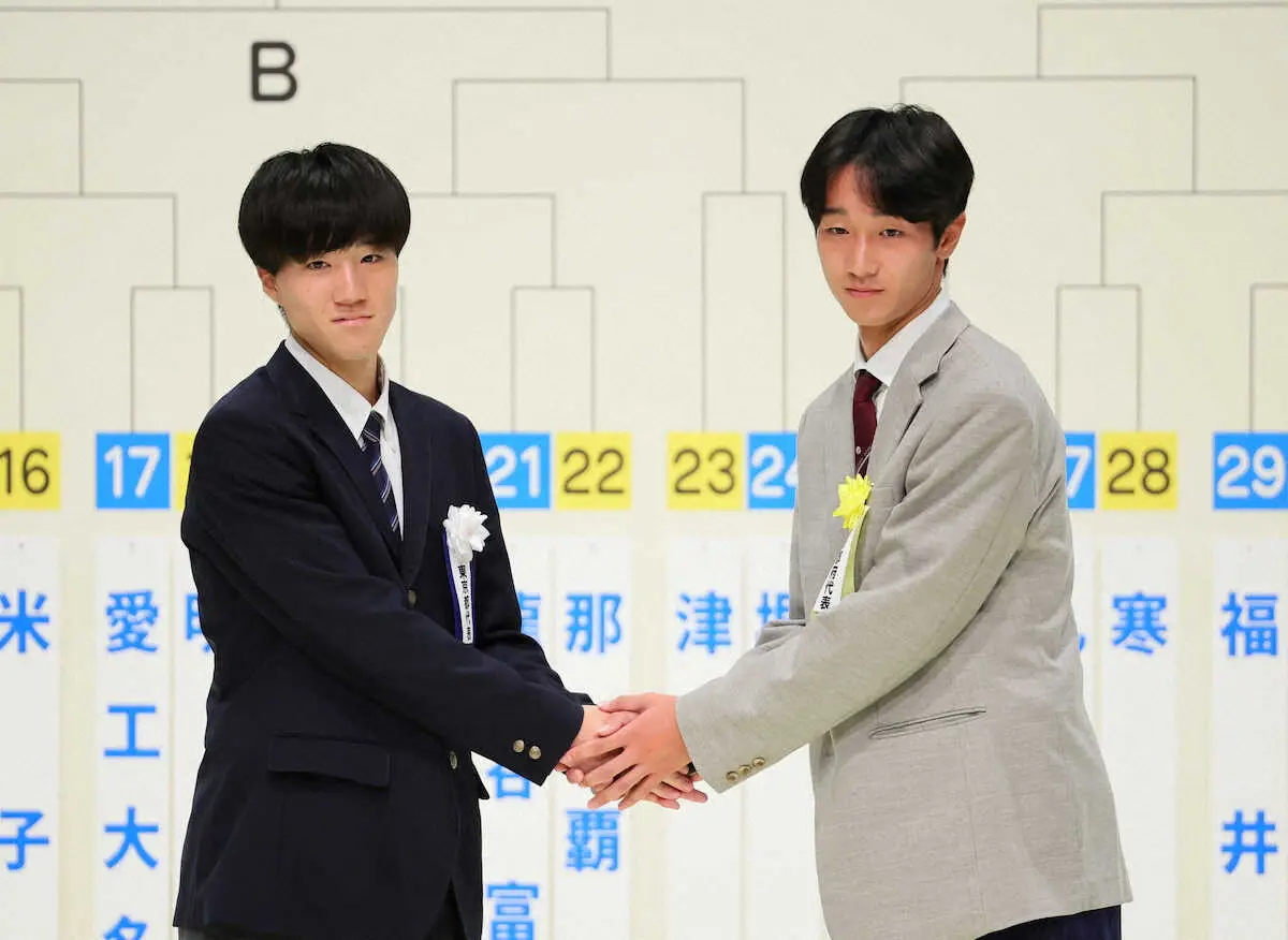 <第103回全国高校サッカー・公開抽選会>初戦の対戦が決まり、握手する帝京・砂押主将(左)と京都橘・宮地主将(撮影・尾崎 有希)