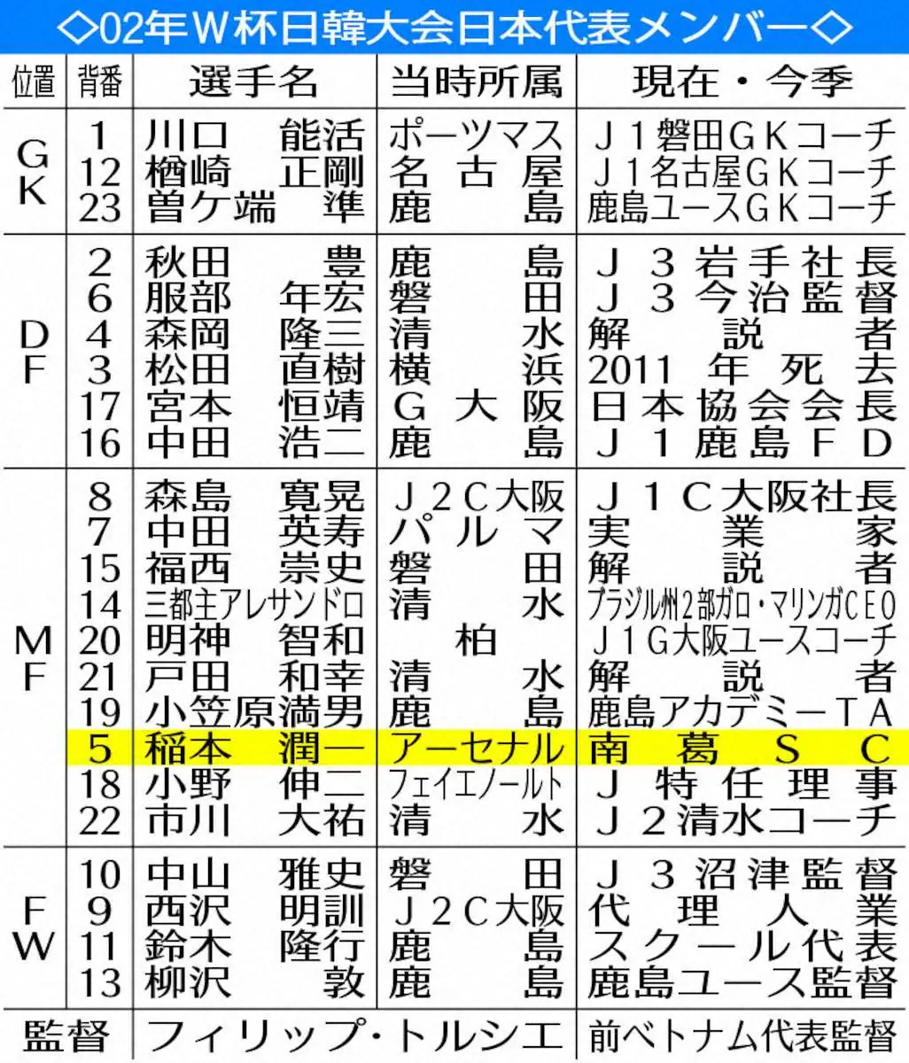 稲本の引退により、日本が初めて決勝トーナメントに進出した02年日韓W杯メンバー23人は全員がピッチを去った。