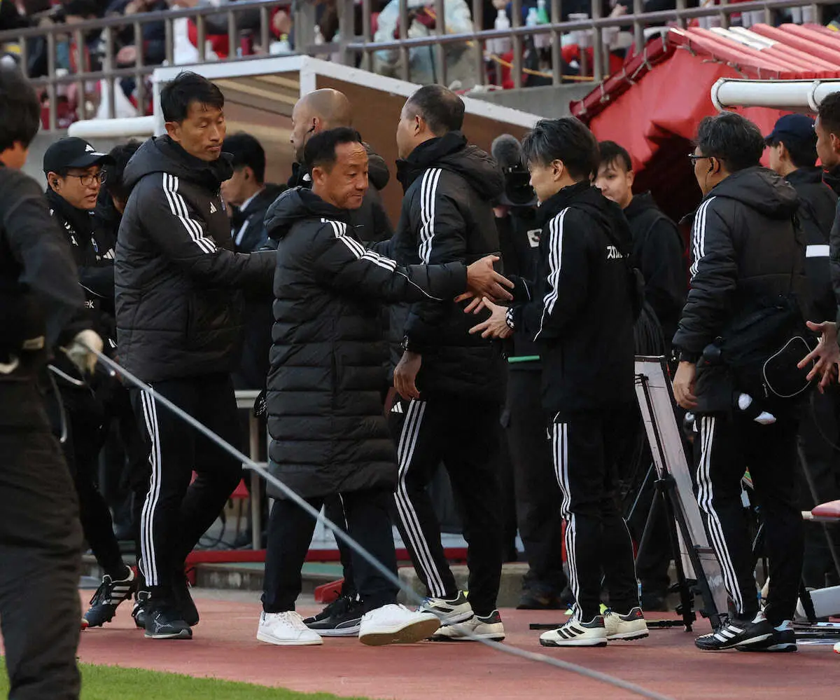 <鹿島・町田>試合終了後、スタッフと握手する町田・黒田監督(撮影・西海健太郎)