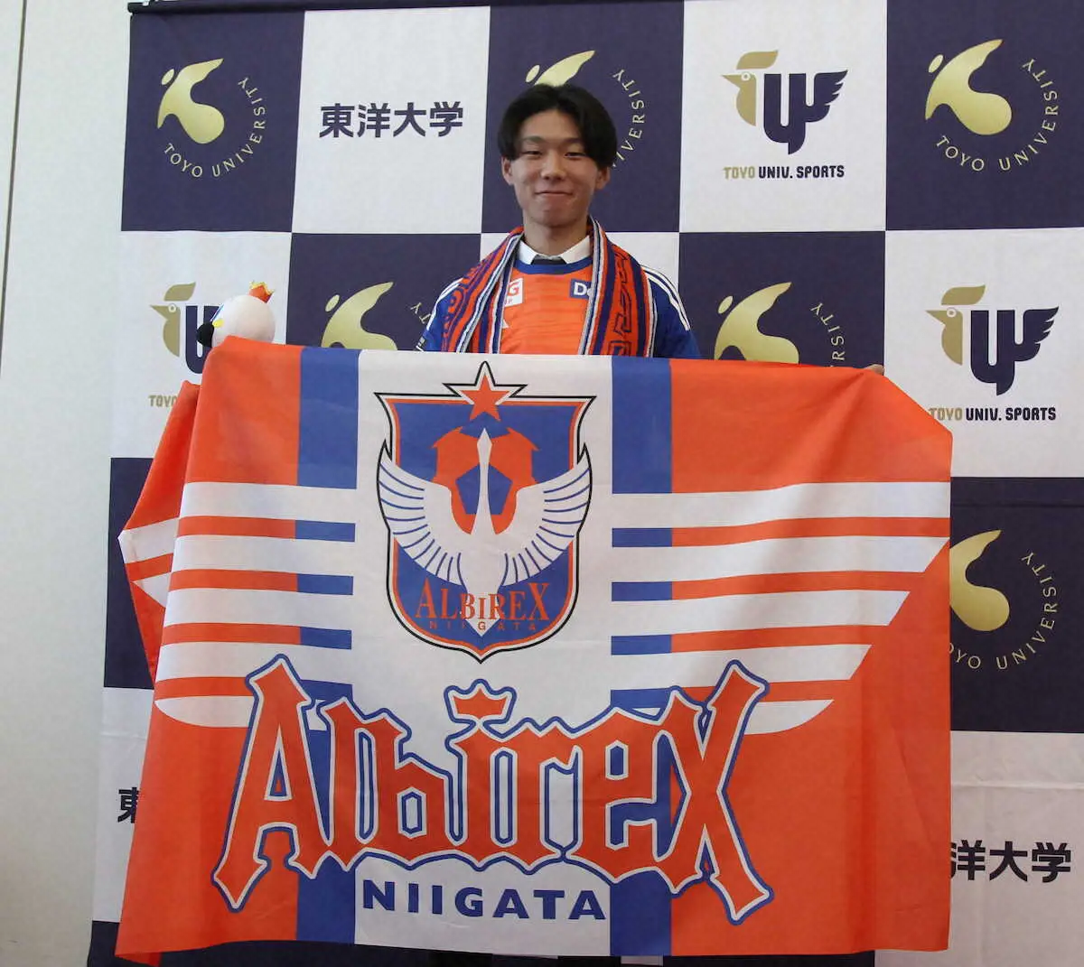 東洋大は9日、都内のキャンパスでJリーグ、WEリーグの加入内定記者会見を行った。サッカー部男子部門から来季Jリーグ入りするのはMF新井悠太(東京V)、DF稲村隼翔(新潟)、MF中山昂大(大宮)、GK前田宙杜(沼津)、MF渡井翔琉(沼津)の5選手。同女子部門からはDF落合依和(大宮)、FW小林莉々子(千葉)、MF宮本妃菜里(新潟)の3選手が来季WEリーグ入りする。