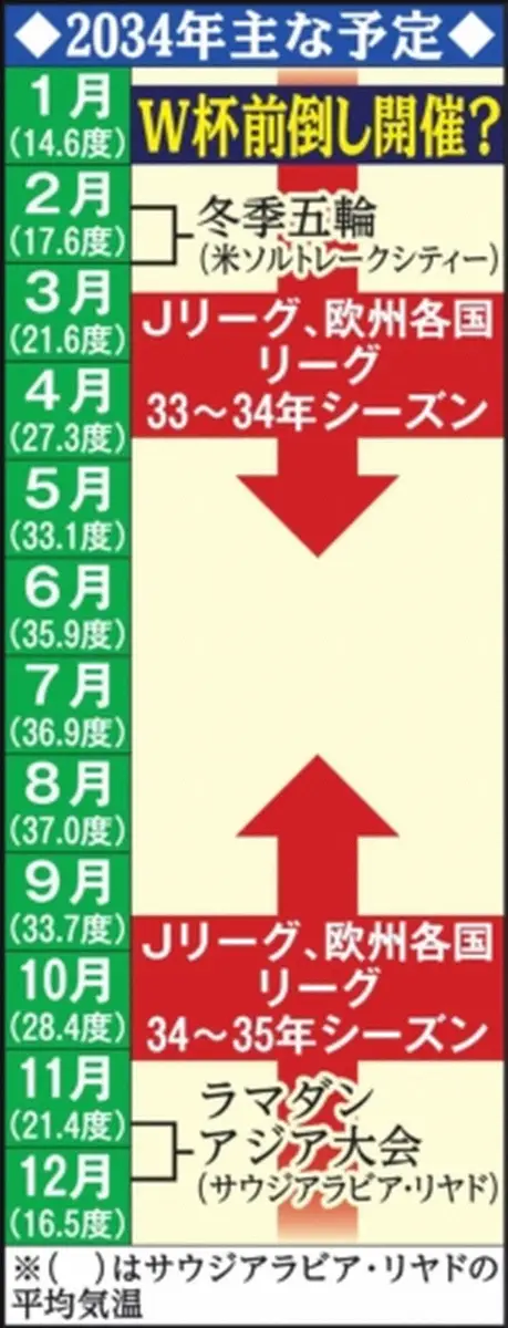 34年W杯サウジ大会は1月前倒しも…2月冬季五輪、夏は酷暑、11月からアジア大会など問題山積み