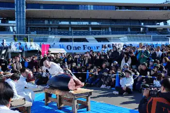 中村憲剛氏引退試合に先駆けて「けんござんまい」のまぐろ解体ショー 選手はブルーカーペットで入場