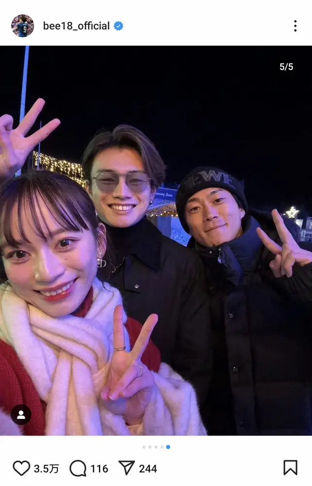 由布と自身、毎熊の3ショットも投稿すると、ハッシュタグでは「Christmas」「クリスマスマーケット」「毎熊晟矢」「観覧車窓無い」と添えた。