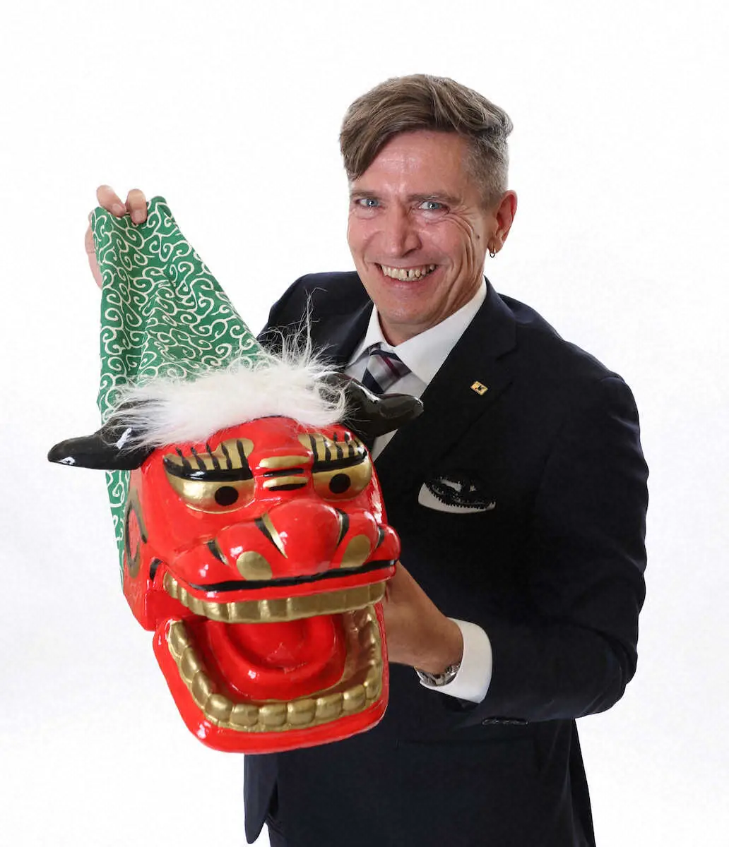 <なでしこジャパン ニールセン監督 スポニチ単独インタビュー>獅子舞を手に笑顔のニールセン監督(撮影・西海健太郎)