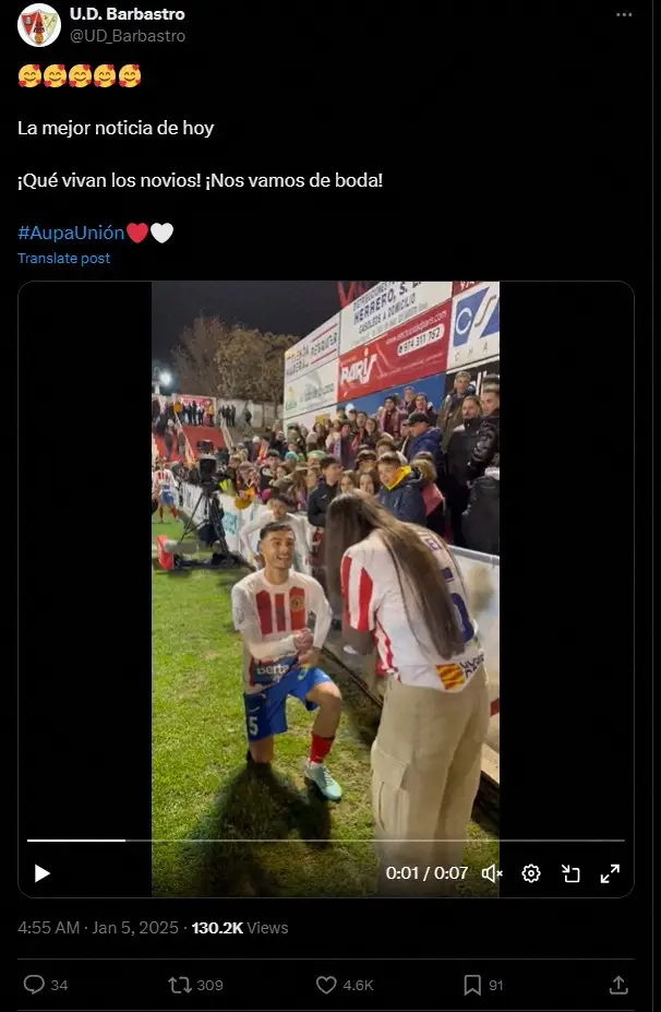 サッカーのスペイン4部の選手が強豪バルセロナに大敗した試合後、プロポーズに成功したとして世界中のサッカーファンから祝福されている。