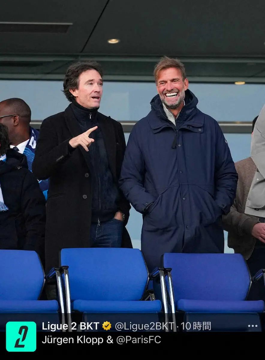 12日にはRBGでサッカー部門のグローバル責任者になった前リバプール監督のユルゲン・クロップ氏がパリFCのホームでアミアン戦を観戦した。13日は練習場を訪れてスタッフや選手と交流。パリFCのピエール・フェラッチ会長を「信じられないほどの温かさで協力的な姿勢を見せてくれた。チームのプロジェクトに情熱を持ち、パリ地域の潜在能力が高いことを確信していた」と喜ばせた。