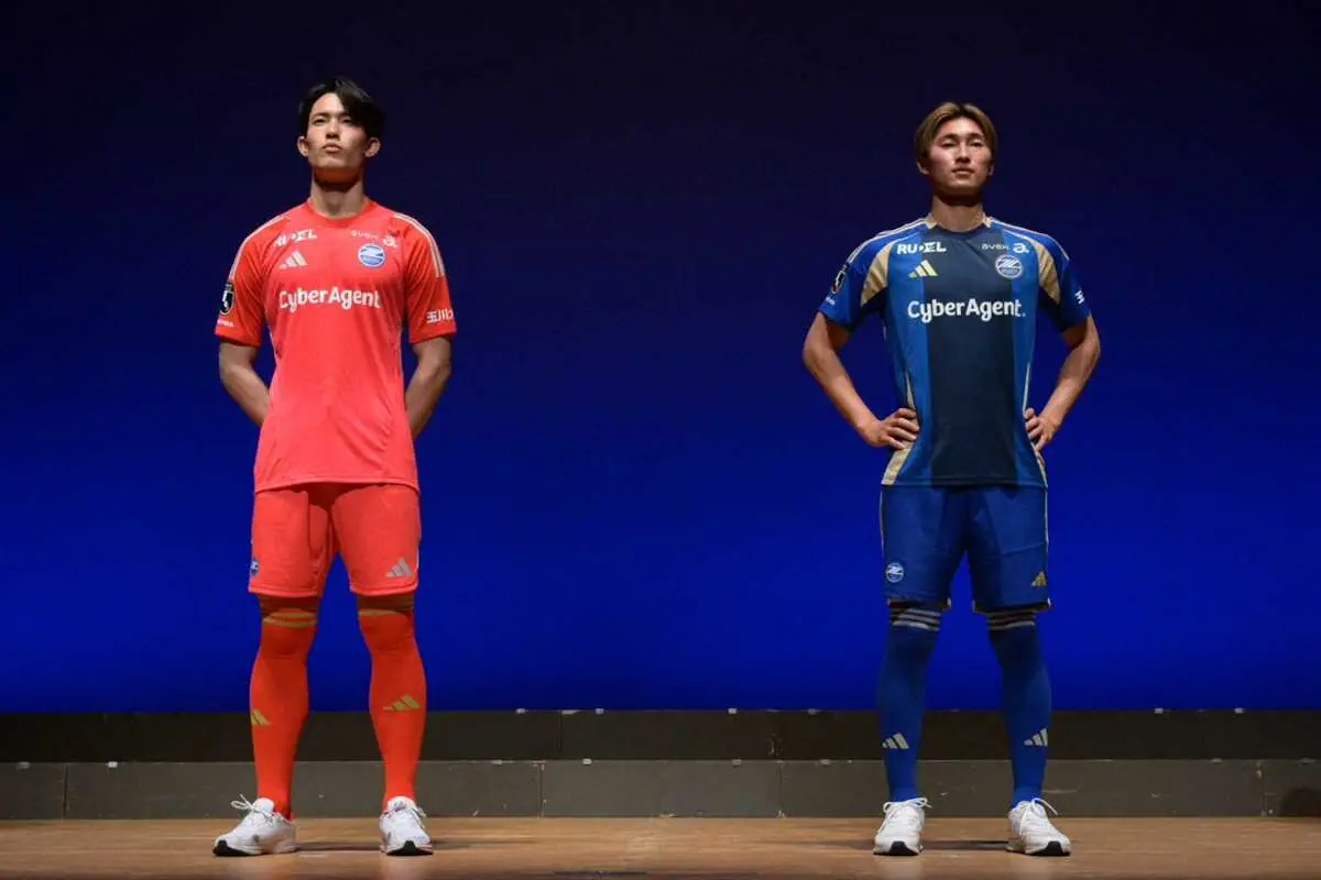 新体制発表会でお披露目されたファーストユニホームを着用するGK谷(左)とFW藤尾(クラブ提供)