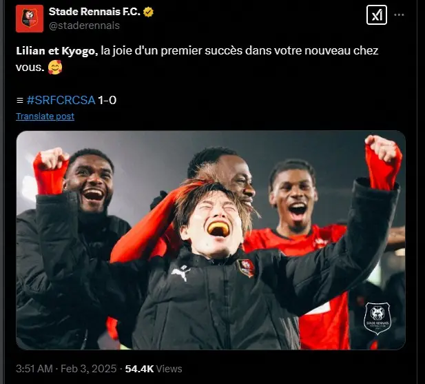 ストラスブール戦で移籍後初出場したレンヌの古橋=レンヌ(共同) Photo by 共同 レンヌ古橋亨梧が先発でフランスデビュー 守備で連敗ストップ貢献、イレ… ギャラリーで見る この記事のフォト 2025年02月03日の画像一覧 もっと見る 2025年02月03日の画像をもっと見る