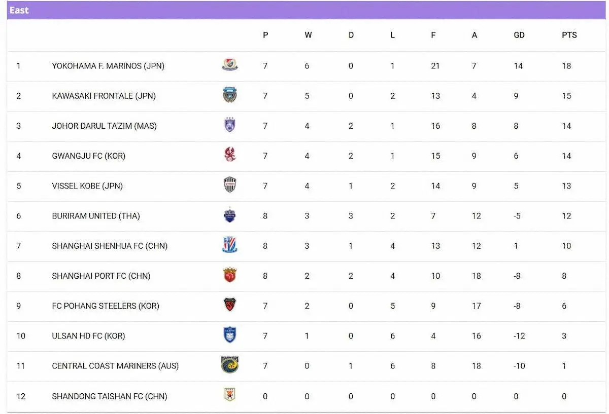 【ACLE東地区1次リーグ順位表】(日本時間20日午前9時現在で山東の試合は無効)