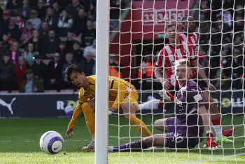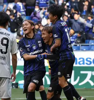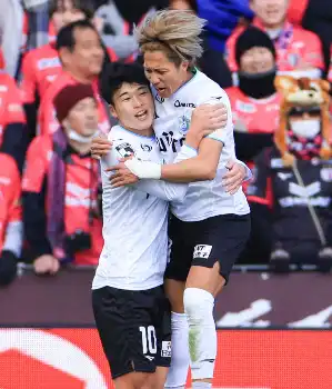 <日本・イラン>前半、同点ゴールを決めた小倉(右)は喜ぶ