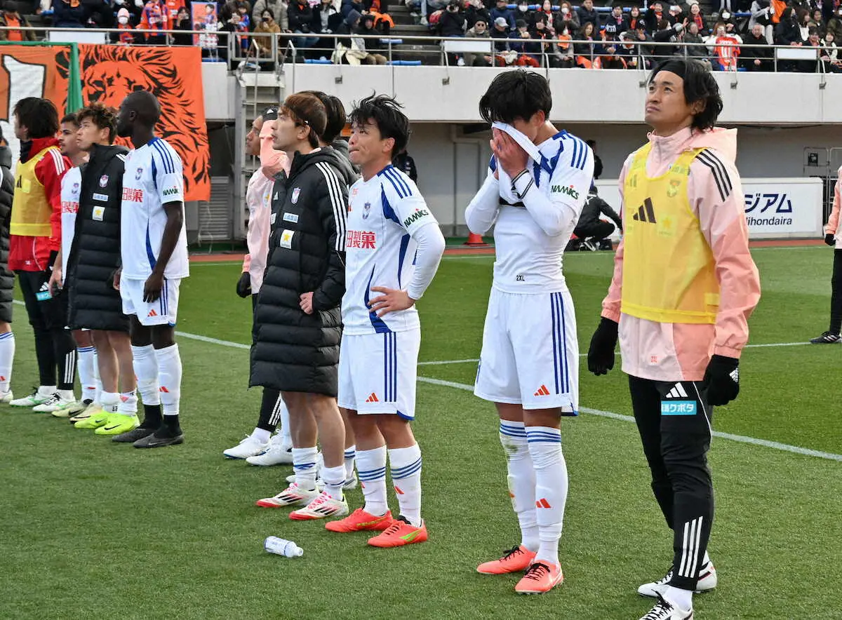 今季初白星を期待して開幕戦の約7000人に続き、この日も約4500人の新潟サポーターが訪れたが、前半で10人での戦いを強いられ、耐えきれずに2失点。試合後のあいさつでサポーターの前に立ったDF稲村の目には涙があふれ「新潟からたくさん来てくれたにもかかわらず、アクシデントもあったけれど情けない試合だった。もっと気持ちを見せた試合を見せたかった」と悔やんだ。