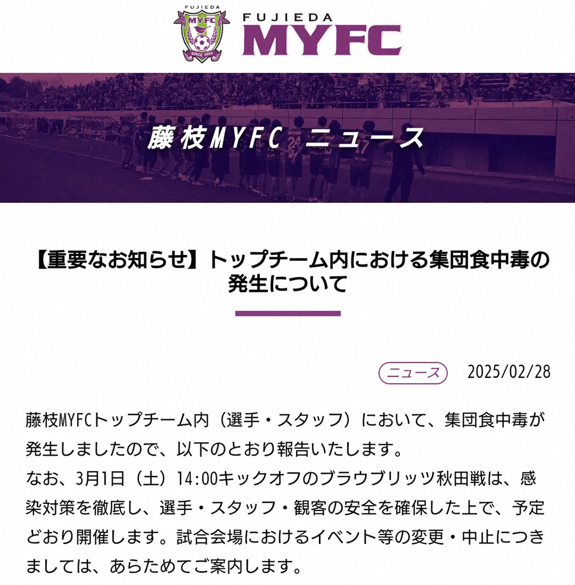 原因は現在保健所が調査中。1日の明治安田J2リーグ第3節・ホーム秋田戦は感染症対策を徹底し、安全を確保した上で、予定通り開催するとしている。