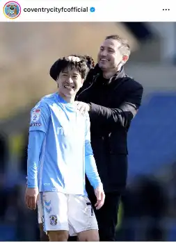 1得点1アシストの活躍でランパード監督(右)に称えられる坂元(クラブ公式インスタグラムから)
