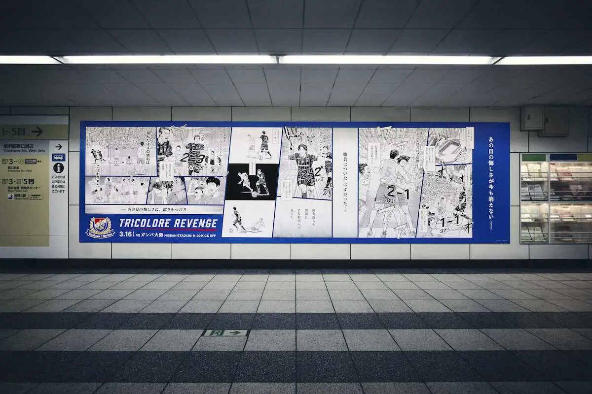 さらに漫画化した屋外用広告を横浜駅の横浜市営地下鉄、東急東横線に掲出。Xの投稿上ではファンやサポーターから「熱い」「カッコよ」「この煽りはカッコイイ!思わず日産スタジアムに行きたくなってしまう」などとコメントが寄せられ、G大阪サポーターからも「プロモーションとしては100点満点」などと反響があった。