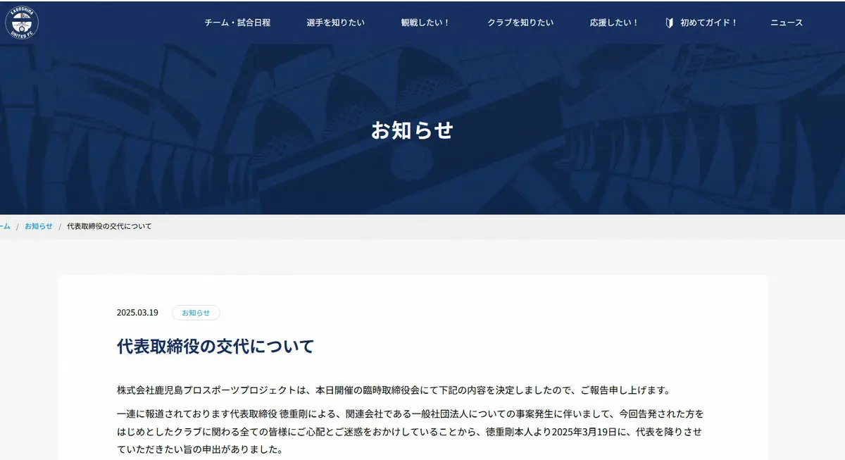 公式サイトを通じ「一連に報道されております代表取締役徳重剛による、関連会社である一般社団法人についての事案発生に伴いまして、今回告発された方をはじめとしたクラブに関わる全ての皆様にご心配とご迷惑をおかけしていることから、徳重剛本人より2025年3月19日に、代表を降りさせていただきたい旨の申出がありました。臨時取締役会において協議の結果、2025年3月19日付で徳重剛は代表取締役を辞任し、新たな代表取締役として湯脇健一郎が就任することを決議いたしました」と報告。「なお、徳重剛は今後も当社取締役として業務には従事する予定です」とも発表した。