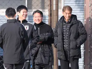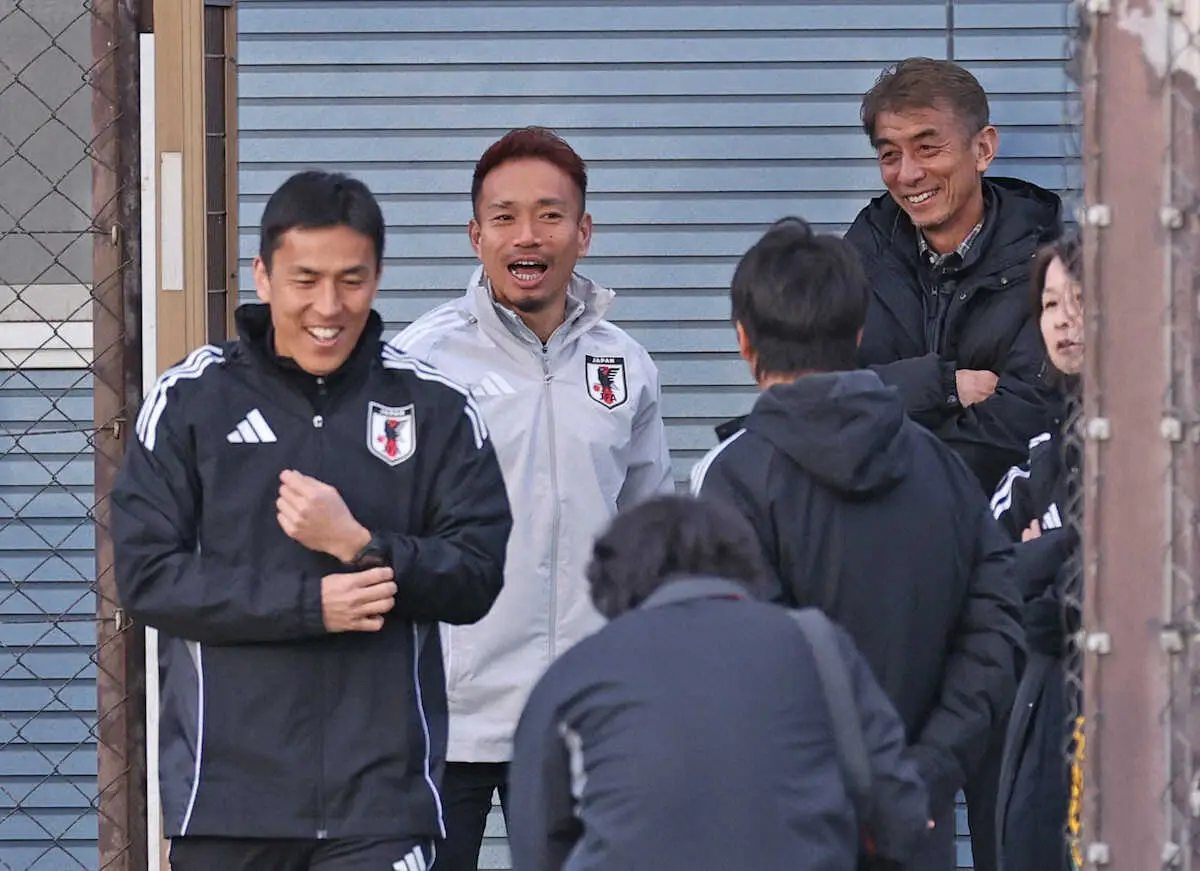 <サッカー日本代表練習>井原正巳氏(右奥)、長谷部コーチ(左)と話す長友(左から2人目)(撮影・西海健太郎)