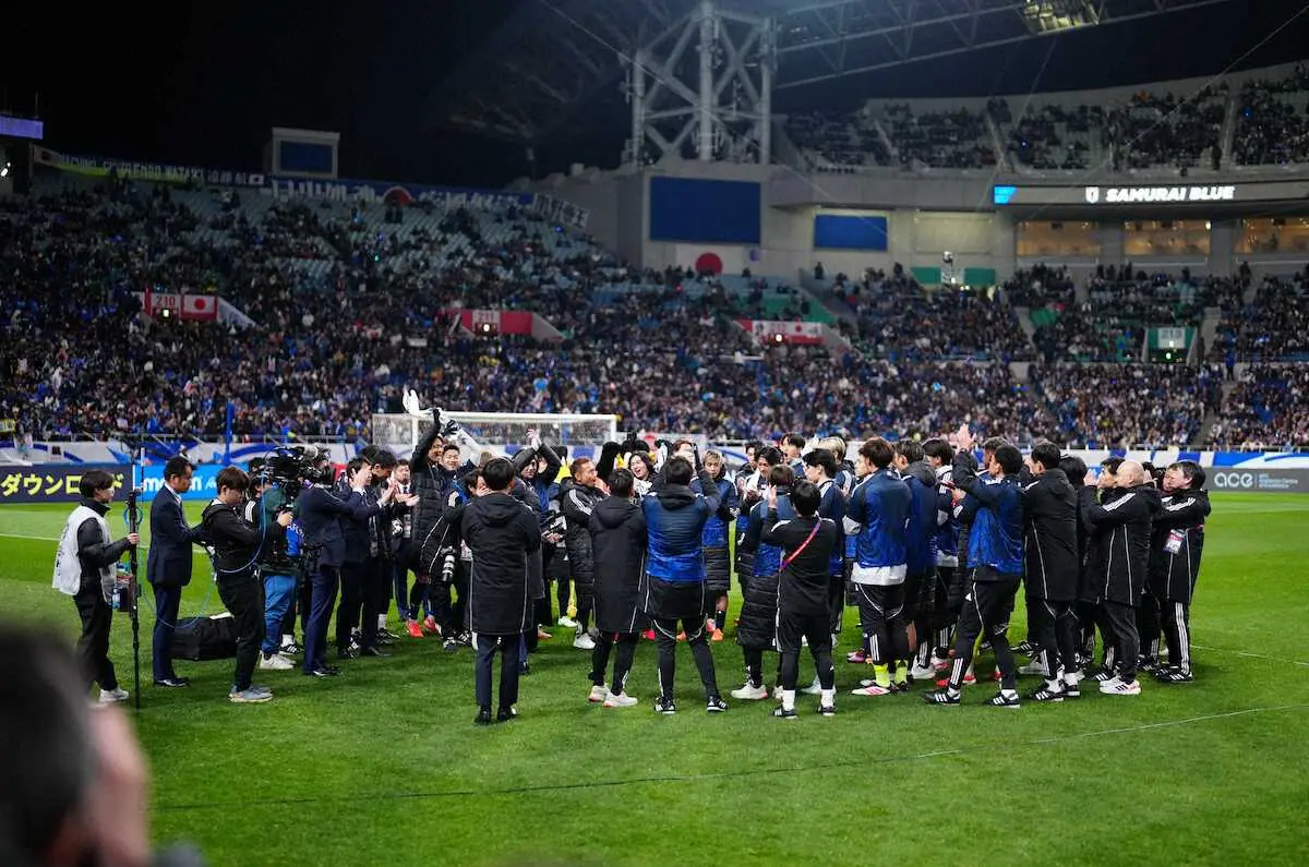 <W杯アジア最終予選 日本・バーレーン>円陣を組み喜ぶ選手たち(撮影・小海途 良幹)