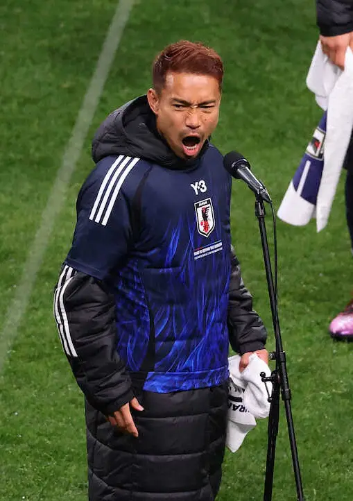W杯出場を決め、試合後のセレモニーで絶叫する長友(撮影・白鳥 佳樹)