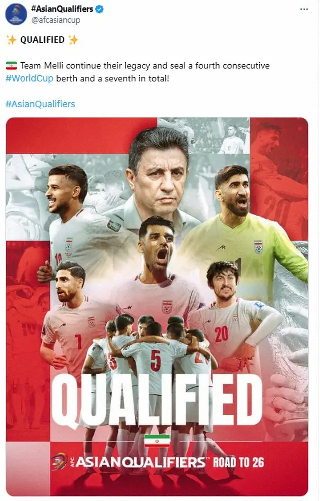 サッカーの26年W杯北中米大会アジア最終予選第8戦が25日、各地で行われ、A組首位のイラン代表(FIFAランク18位)が本拠で2位ウズベキスタン代表(同58位)と2ー2のドロー。勝ち点20に伸ばし同組2位以上が確定。日本代表に続きアジア勢2番目にW杯切符を獲得。一方、同組最下位の北朝鮮代表(同111位)はUAE代表(同63位)に終了間際の失点で1ー2と敗戦。プレーオフ進出の4位以上になる可能性がなくなり、同予選完全敗退した最初のチームとなった。