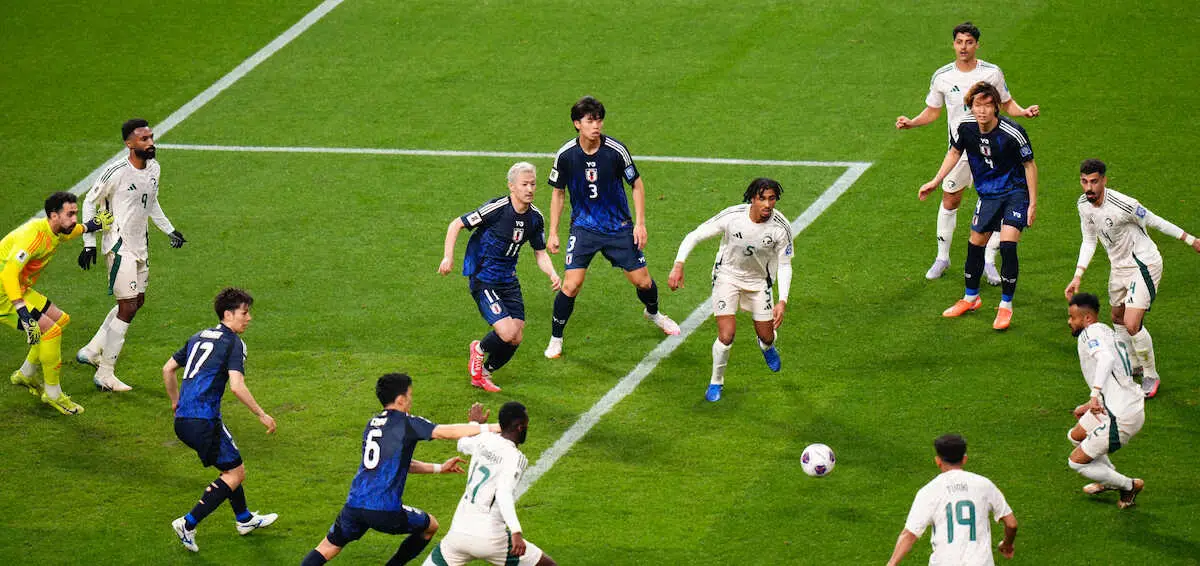 【松井大輔 視点】日本代表はセンターバックから左の中村、右の菅原に当て、その後にポケットを取りにいく攻撃が多かった。サウジアラビアは序盤から5バックでブロックを組んで守ってきた。中を締められ、仕方ない部分もあるが、少し単調になりアイデアの少なさを露呈してしまった。