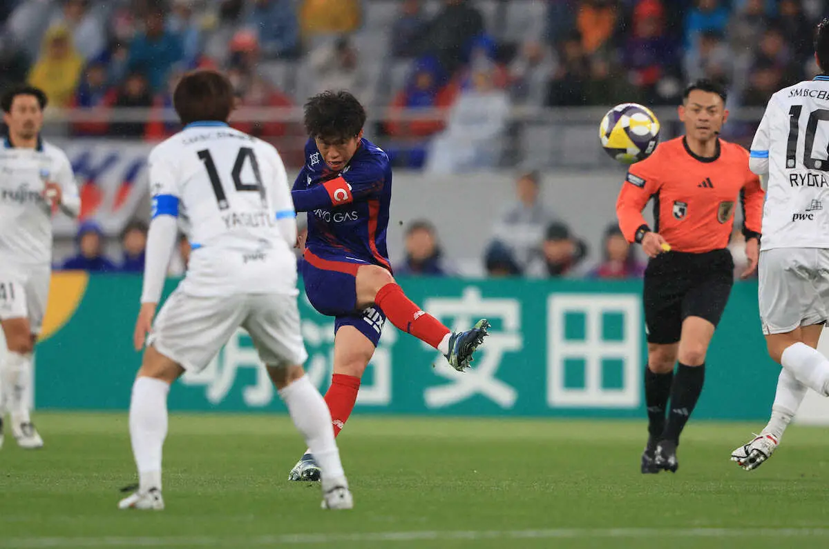 <FC東京・川崎F>前半、シュートを放つFC東京・高(中央)=撮影・松永 柊斗