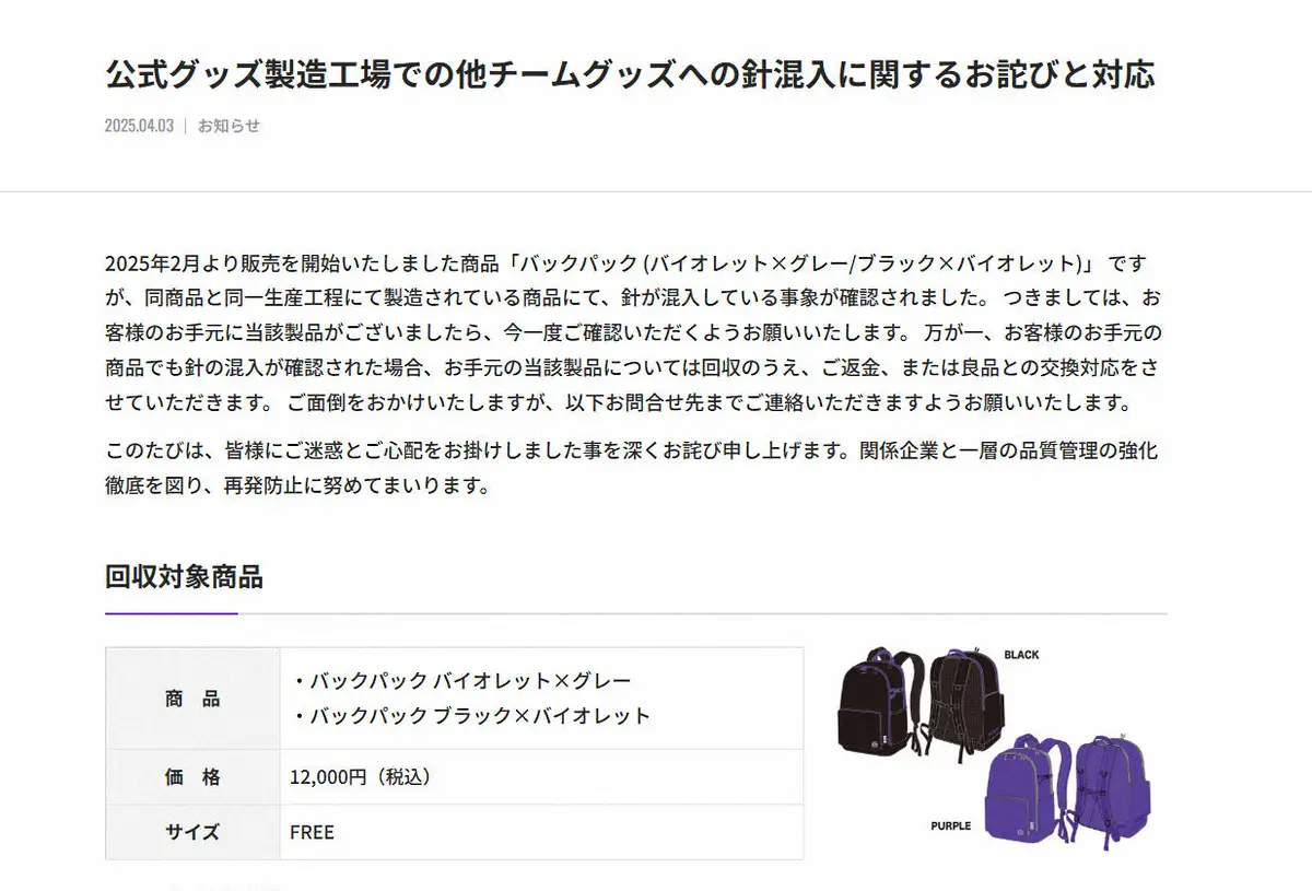 広島は「2025年2月より販売を開始いたしました商品「バックパック (バイオレット×グレー/ブラック×バイオレット)」 ですが、同商品と同一生産工程にて製造されている商品にて、針が混入している事象が確認されました」と報告。