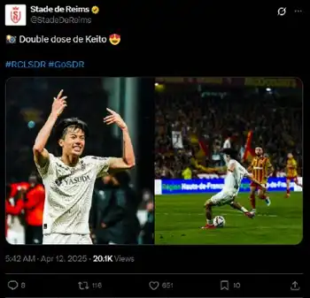 中村敬が欧州にその名を刻んだ。この日はチームの全得点を挙げて快勝に貢献した。これで今季はリーグ11得点。欧州5大リーグでは中田英寿、高原直泰、香川真司、岡崎慎司に続き、日本人5人目の1シーズン2桁得点を達成。また、フランス1部では南野拓実(モナコ)の9得点(23~24年)を抜き、日本人シーズン最多得点記録を更新した。