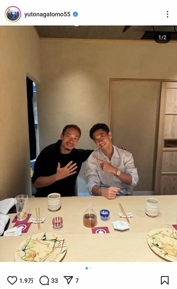 サッカー日本代表DF長友佑都(38=FC東京)が23日までに自身のインスタグラムを更新。元日本代表MF香川真司(36=C大阪)との食事会ショットを披露した。