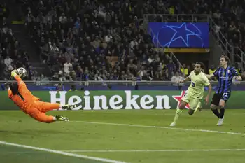 <インテル・ミラノ×バルセロナ>延長前半、ゴールを決めるインテル・ミラノのフラッテージ(AP)