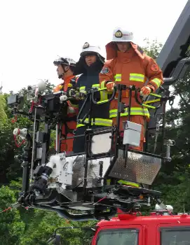 川崎Fが川崎市消防局にリボンマグネットを贈呈 脇坂と大関が消防服ではしご車搭乗体験