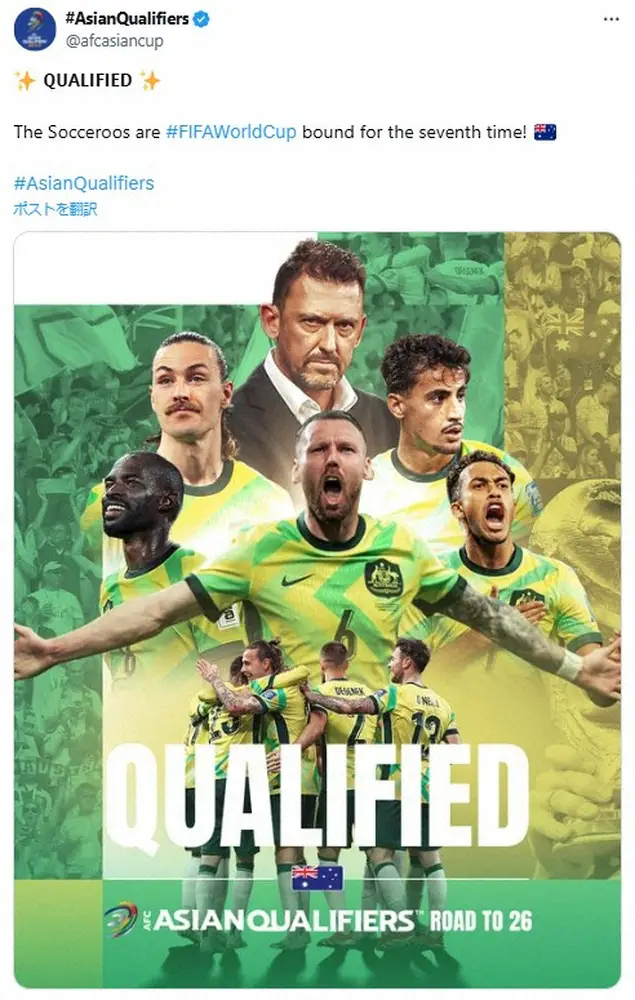 サッカーの26年W杯北中米大会アジア最終予選第10戦(最終戦)が10日、各地で行われ全日程が終了。オーストラリアが敵地でサウジアラビアに2ー1で勝利し、6大会連続7回目のW杯出場決定。日本、イラン、韓国、ウズベキスタン、ヨルダンに続きストレートイン最後の1枠に滑り込んだ。