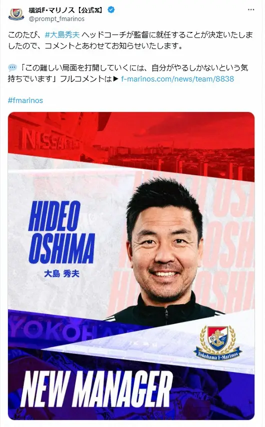 大島新監督は現役時代に横浜フリューゲルスでプロ生活をスタートし、横浜Mやアルビレックス新潟などでプレー。16年にギラヴァンツ北九州で引退し、17年から横浜Mで指導者キャリアをスタートすると、その後はチーム一筋で支えてきた。