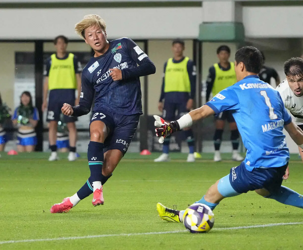 この日一番の盛り上がりを見せたのは、後半アディショナルタイム。FW碓井がGKとの一騎打ちに勝ち、ゴールネットを揺らしたかに見えた。しかしVARの結果、オフサイドと判定された。幻のゴールに碓井は「映像を見たら、上半身の半分が出ているかなと思った。少しタイミングが早かったという部分で、自分の我慢する力が足りなかった」と反省点を述べた。しかし「ゴール前での冷静さというのはJ1でも通用することが分かったので、これからも冷静さを保ってプレーしたい」と前向きな言葉も残した。