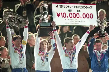 新生日本代表をめざし、ガッチリと握手する加茂周新監督(左)と加藤久新強化委員長
