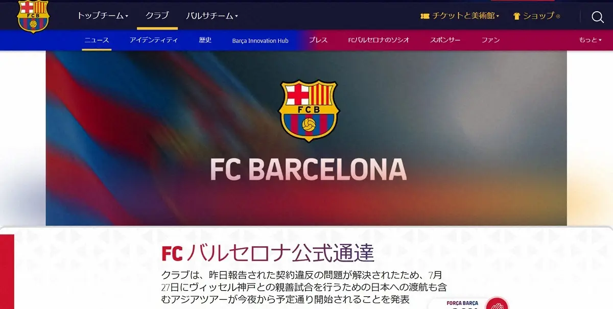 サイトではバルセロナのトップチーム一行がすでに日本に向かっていることを報告するとともに「契約違反の問題が解決されたため、7月27日にヴィッセル神戸との親善試合を行うための日本への渡航も含むアジアツアーが予定通り行われる」と伝えた。