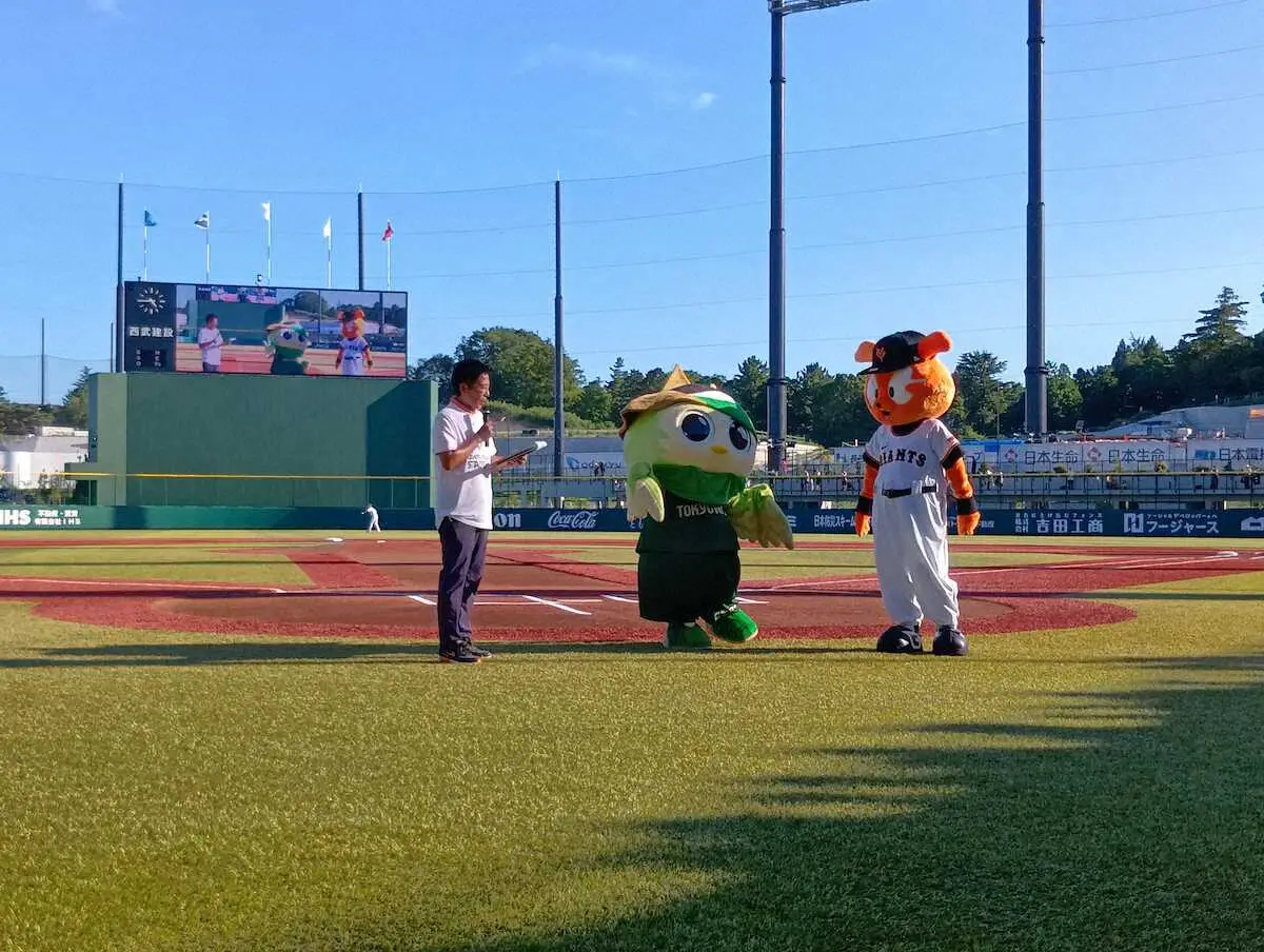 東京Vのマスコットがプロ野球のイースタン巨人戦に“出張”