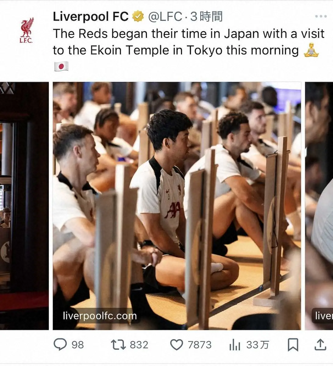 30日に横浜Mと親善試合(日産ス)で顔を合わせるリバプールは28日、都内の寺院で瞑想(めいそう)するイレブンの姿を公式SNSに投稿した。
