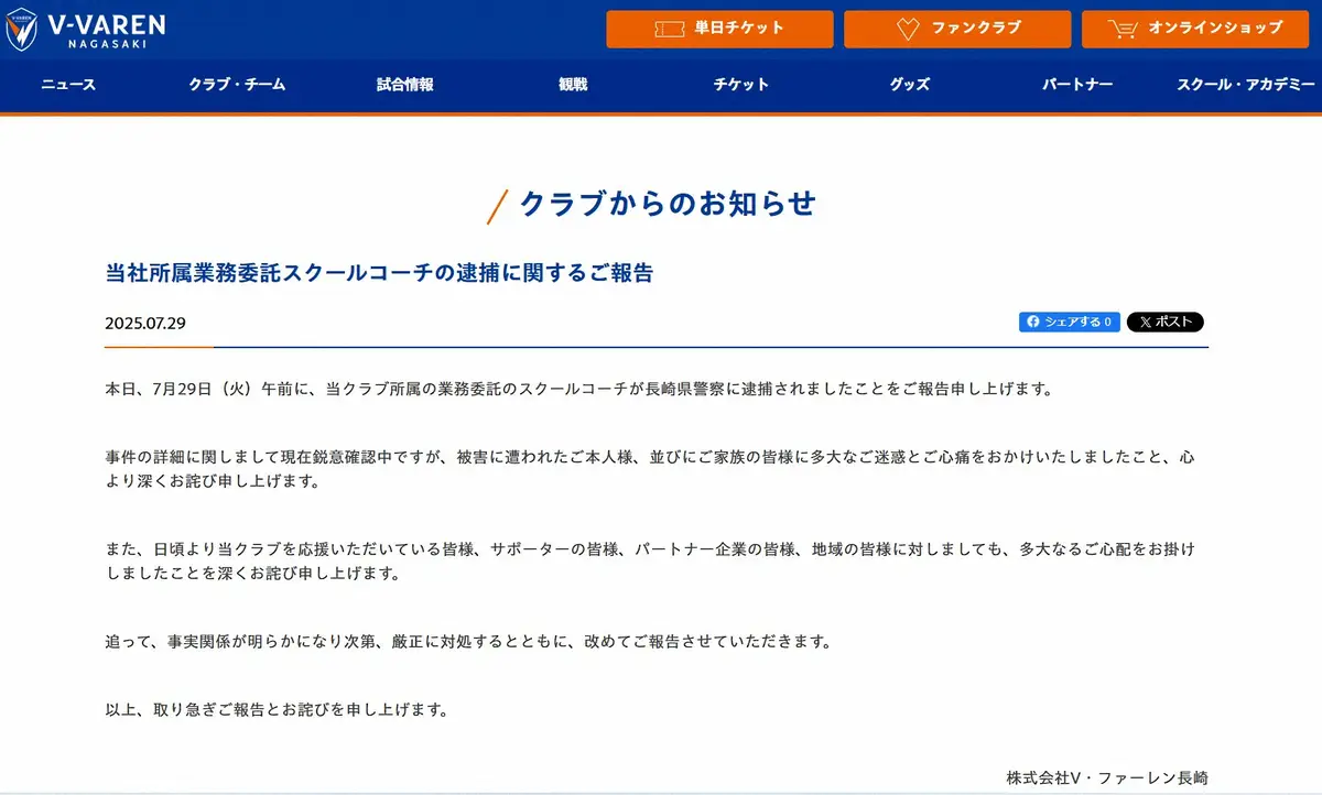 J2長崎の公式X(@v_varenstaff)から J2長崎 スクールコーチが逮捕「被害に遭われたご本人様、ご家族の皆様に… ギャラリーで見る この記事のフォト 2025年07月30日の画像一覧 もっと見る 2025年07月30日の画像をもっと見る