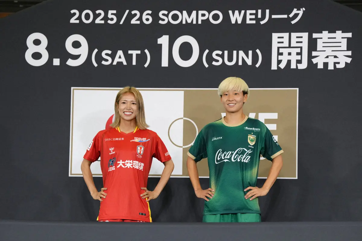 <WEリーグキックオフカンファレンス>開幕戦で対戦するINAC神戸・成宮(左)と日テレ東京V・菅野