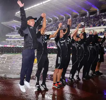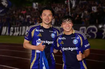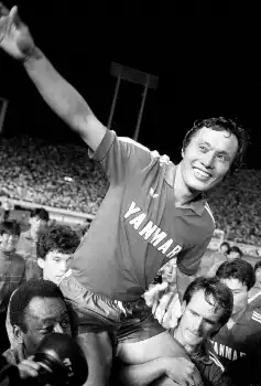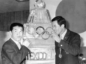1968年メキシコ五輪で獲得した銅メダルを胸に祝杯をあげる釜本邦茂さん(右)と杉山隆一