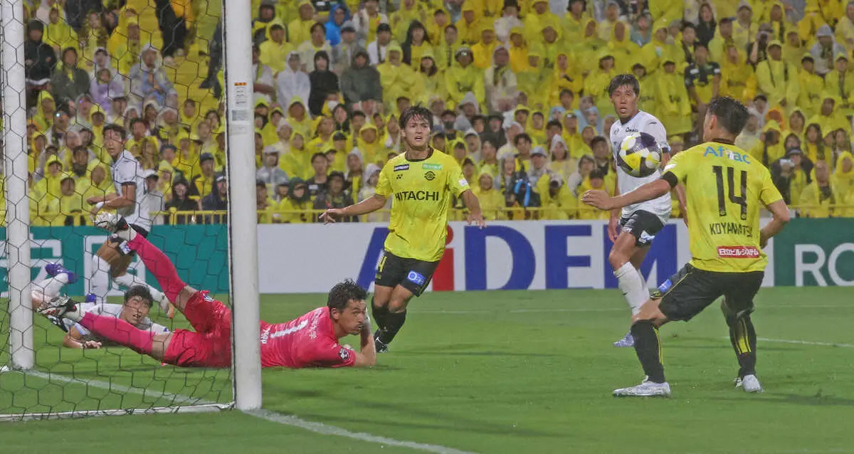 雨と強風が吹き荒れる中で序盤から主導権を握った柏は前半終了間際、左サイドの小屋松知哉を起点に右に展開。MF渡井のクロスが相手DFに当たってGKがはじき、こぼれたところに左から詰めたMF小屋松が胸で当てて押し込んだ。