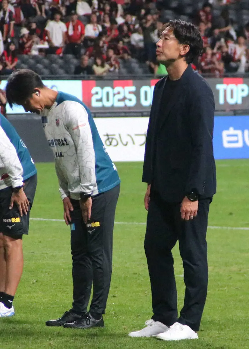試合終了後にサポーターに挨拶するJ2札幌の柴田監督(右)