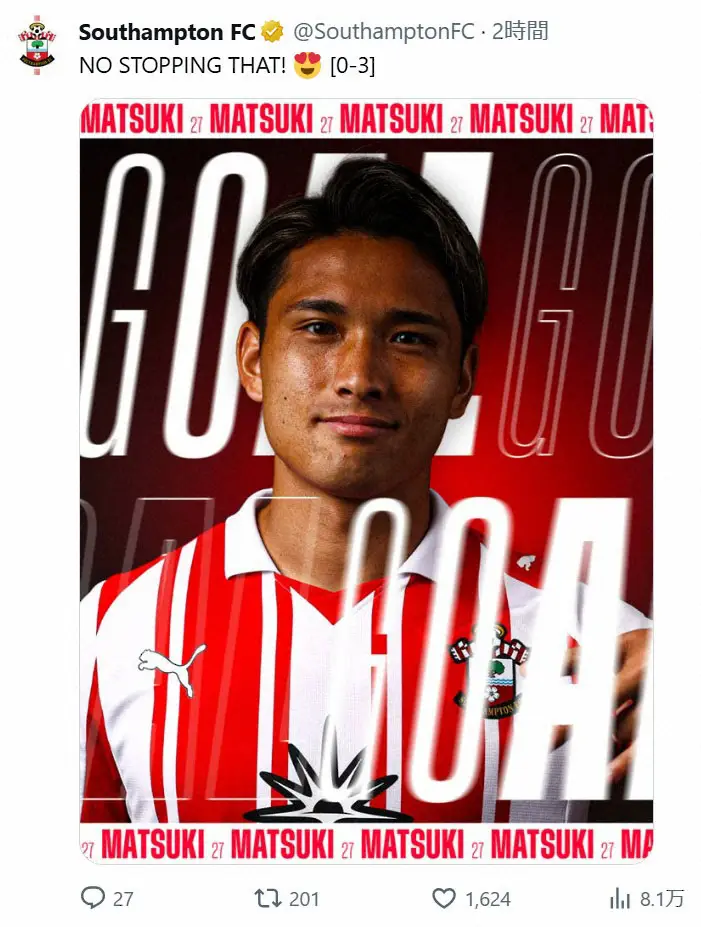 サウサンプトン松木玖生が初ゴール!強烈な左足ミドル弾に指揮官「練習で見たことがないプレー」
