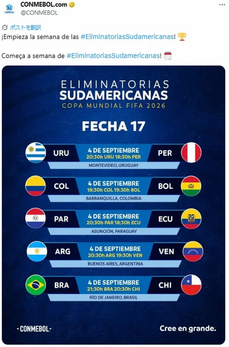 26年W杯北中米大会の南米予選は残り2試合。ここまで首位アルゼンチン、2位エクアドル、3位ブラジルがW杯出場権を獲得。一方で最下位チリの予選敗退が決定。4日の第17戦、9日の最終戦にて本大会ストレートインの残り3枠と大陸間プレーオフ出場1枠を巡る熱戦がいよいよ決着を迎える。