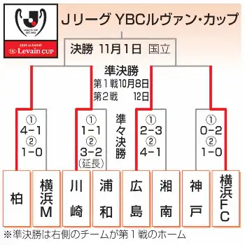 広島は湘南に4―1と快勝、合計で6―4と逆転し4強入り。柏は横浜Mを1―0で退けて合計5―1、川崎Fは浦和に延長の末、3―2で競り勝ち、合計4―3とした。準決勝は柏―川崎F、広島―横浜FCで10月8、12日にホーム&アウェー方式で行われる。