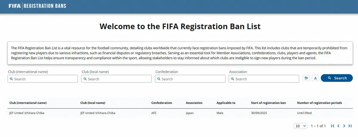 国際サッカー連盟(FIFA)は1日までに、J2千葉を選手の新規登録を禁止するクラブのリストに掲載した。処分は9月30日付。期限は「解除されるまで」とした。