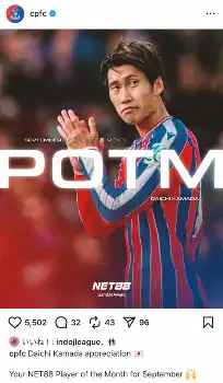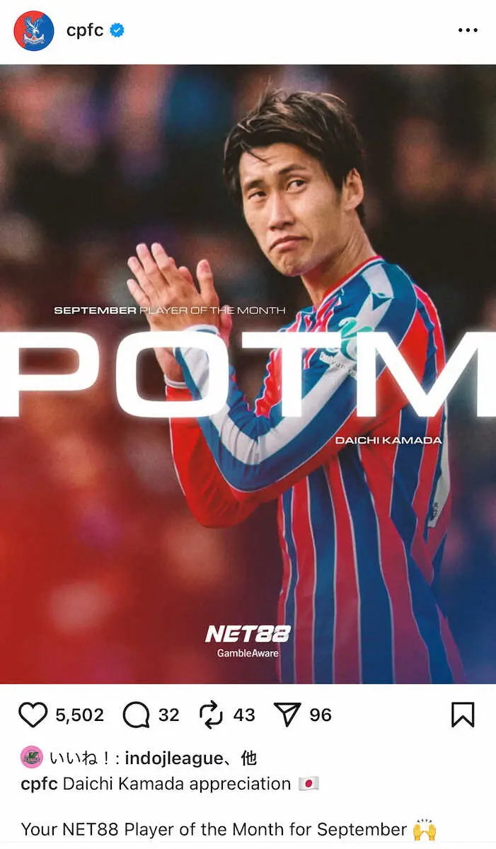 サッカーのイングランド・プレミアリーグでクリスタルパレスに所属する日本代表MF鎌田大地が4日、9月のクラブ月間MVPに選出された。