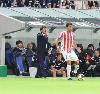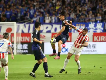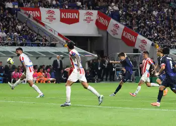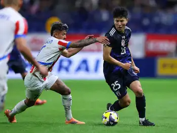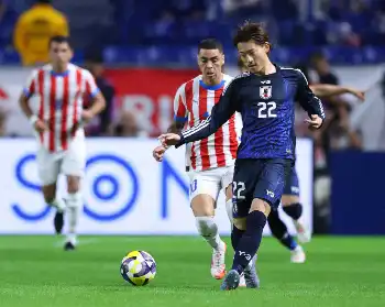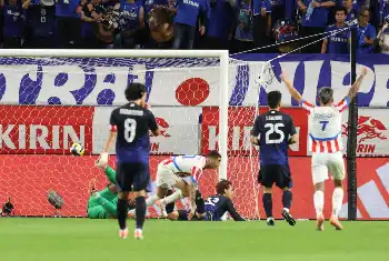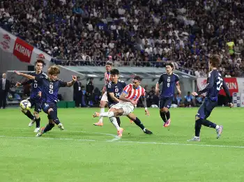 <日本・パラグアイ>前半、競り合う佐野(撮影・後藤 大輝)