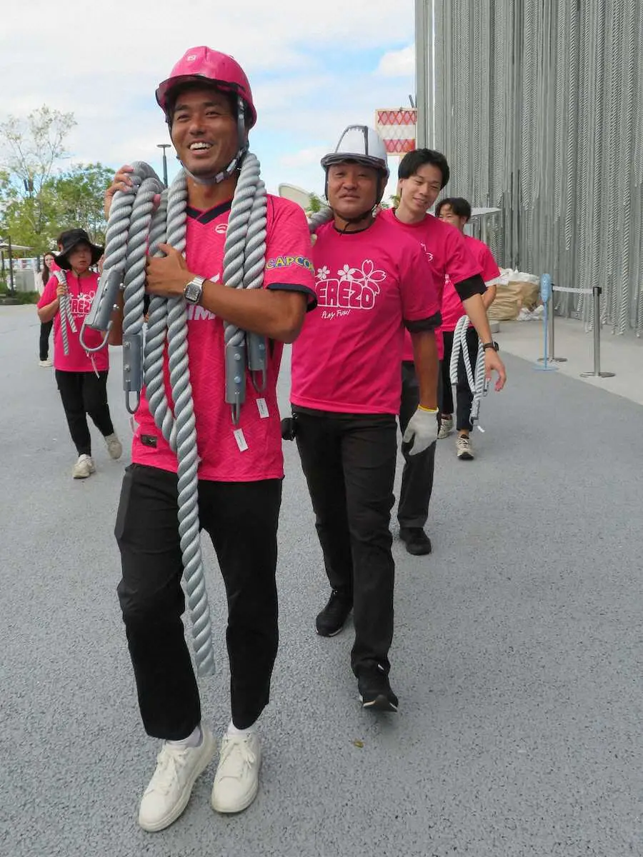 ポルトガル館から頂いた綱をC大阪は丸橋アンバサダーを先頭にスタッフが運んだ