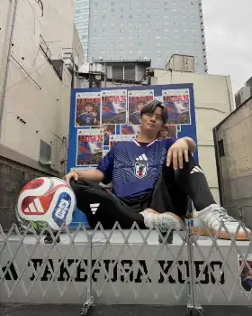新ユニホームを着用して、座って笑みを浮かべる表情は迫力満点。16日まで公開予定で、SNS上では早くも「でっかい久保建英が座っておった」「巨大すぎる!」など話題を集めていた。